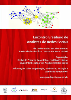 Passo aqui para divulgar uma agenda interessante. Mantendo a tradição de organizar um evento anual sobre a temática da análise de redes sociais, o GIARS - Grupo de Pesquisa Interdisciplinar em Análise de Redes Sociais, com apoio da CAPES, FAFICH, CPEQS , Programa de Pós Graduação em Sociologia - UFMG, CEDEPLAR e PUC-MG, promoverá entre os dias 28 de outubro e 01 de novembro, no campus da UFMG, o Encontro Brasileiro de Analistas de Redes Sociais .