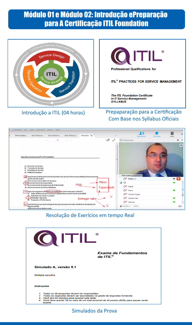 - 04 encontros noturnos voltados exclusivamente para prepará-lo para a certificação ITIL Foundation. Você aprenderá todo o conteúdo necessário para ser um certificado em ITIL Foundation, faremos simulados, questões, e eu darei todas as dicas para que seja aprovado com um alto percentual. Carga horária total desta segunda etapa: 16 horas.